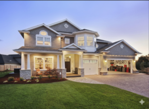 A beautifully designed modern family home featuring elegant siding, warm exterior lighting, and a spacious front lawn. The property includes